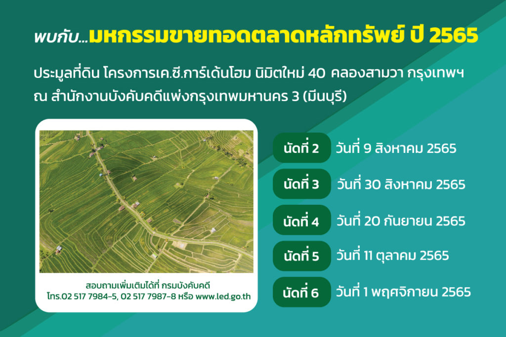 กรมบังคับคดี ร่วมกับบริษัท ขอเชิญร่วมประมูลที่ดินเปล่าโครงการเค.ซี.การ์เด้นโฮม ถนนนิมิตใหม่ 40 คลองสามวา, มีนบุรี กรุงเทพฯ ณ สำนักงานบังคับคดีแพ่งกรุงเทพกรุงเทพมหานคร 3 มีนบุรี (บริเวณศูนย์การค้าเสียงสมบูรณ์)
