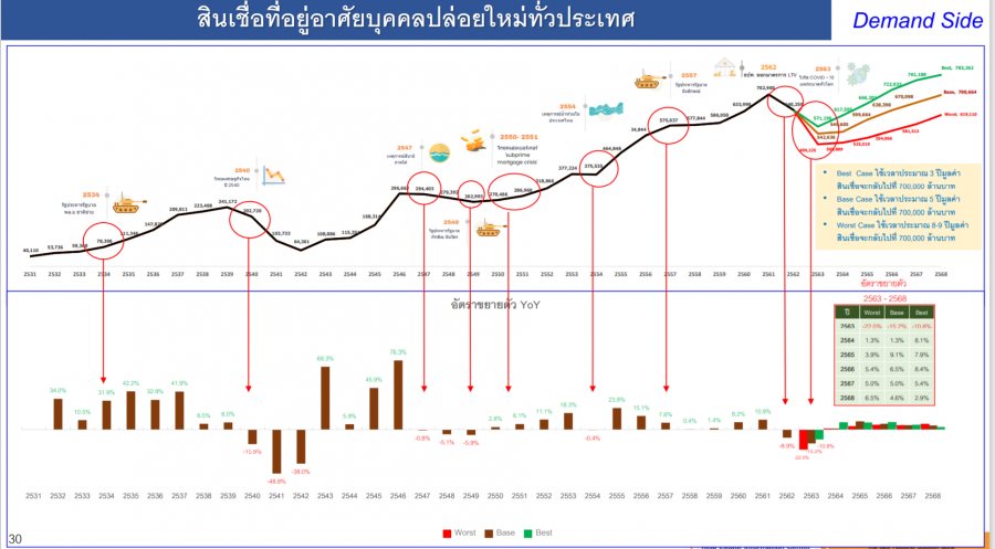 โดยคาดว่าต้องใช้เวลาถึง5ปี กว่าตลาดอสังหาฯ จะฟื้นกลับไปในจุดที่เติบโตสูงสุดในปี2561 ซึ่งมีการให้สินเชื่อที่อยู่อาศัยใหม่ทั่วประเทศสูงสุดอยู่ที่702,900ล้านบาท
