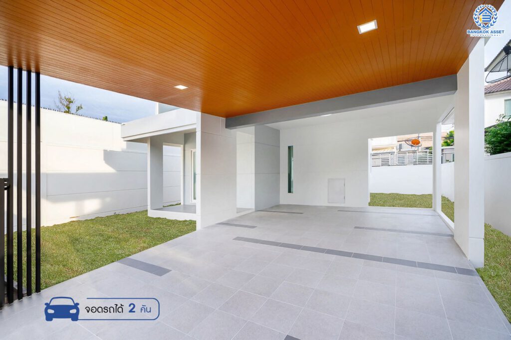 โรงรถเราได้ปรับปรุงโดยเน้นความโปร่งกว้าง และต่อเติมหลังคาโรงรถให้เป็นเพดานระแนงไม้เฌอร่า และปูพื้นด้วยกระเบื้องกันลื่น ลวดลายเฉพาะของบ้านบางกอกฯ เพื่อความสวยงามและปลอดภัยแก่ผู้อยู่อาศัย