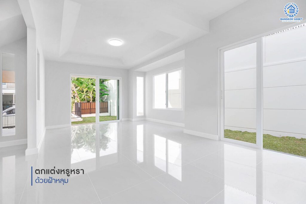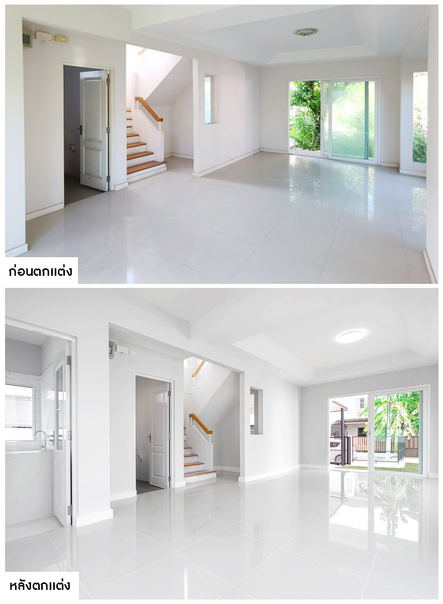 ภายในสัมผัสความกว้างด้วยสีโทนขาวสว่าง ที่จะช่วยให้บ้านดูโปร่งโล่งยิ่งขึ้น นอกจากจะตกแต่งฝ้าเพดานใหม่แล้ว เรายังเปลี่ยนพื้นให้เป็นพื้นกระเบื้องแบบแกรนิตโต้แผ่นใหญ่ ที่สวยงามและนิยมในบ้านยุคใหม่ พร้อมเพิ่มมิติให้กับโถงภายในด้วยแสงไฟดาวน์ไลท์ ทั้งประหยัดไฟ ให้ความสวยงาม และเรียบหรู