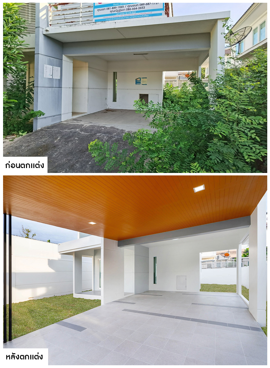 จากบ้านที่มีสีซีดจางและดูรก เราได้ทำการเคลียร์พื้นที่บริเวณบ้านเพื่อเพิ่มพื้นที่สนามหญ้าสำหรับทำกิจกรรม เปลี่ยนรั้วใหม่ให้ดูสวยงามรับกับตัวบ้าน พร้อมทาสีใหม่ทั้งหลังเป็นโทนสีขาวสว่างตัดฟ้าคราม เพิ่มความโมเดิร์นและความสวยงามโดดเด่นมากยิ่งขึ้น